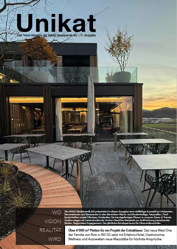 Im Mittelpunkt dieser Ausgabe stehen das 30-Jahr-Jubiläum der WASU Baukeramik AG sowie der Weg von der Einzelfirma zur Aktiengesellschaft. WASU blickt mit Stolz auf die Entwicklung des Betriebs und die Etablierung der verschiedenen Fachbereiche zurück. Heute zählt die WASU Baukeramik AG dank viel Erfahrung und fundiertem Fachwissen zu den führenden Anbietern auf dem Markt. Unsere Keramik- und Natursteinplatten für Böden und Wände inspirieren und lassen einzigartige Ideen im privaten sowie industriellen Bereich entstehen.